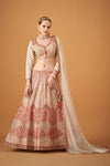 Lehenga showcasing exquisite embroidery includes red and pink resham work with golden sequins adding sparkle to the piece. Geometric patterns and floral motifs adding grace to the outfit.