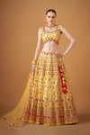 This lehenga is in a vibrant shade of yellow featuring intricate embroidery in red, and green hues, along with silver foil work. Dupatta provides an elgant drape over the shoulders and enhances the overall appeal.