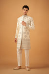 Sherwani with offwhite base exudes elegance and sophistication. The light blue embroidery adds a refreshing contrast, creating a harmonious blend. Swarovski embellishments adds a touch of sparkle and opulence.